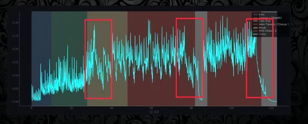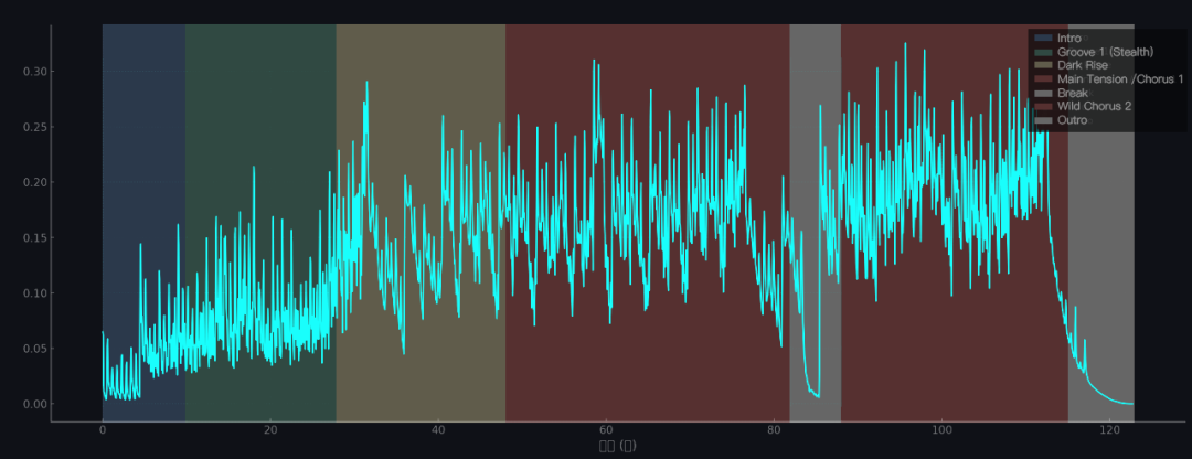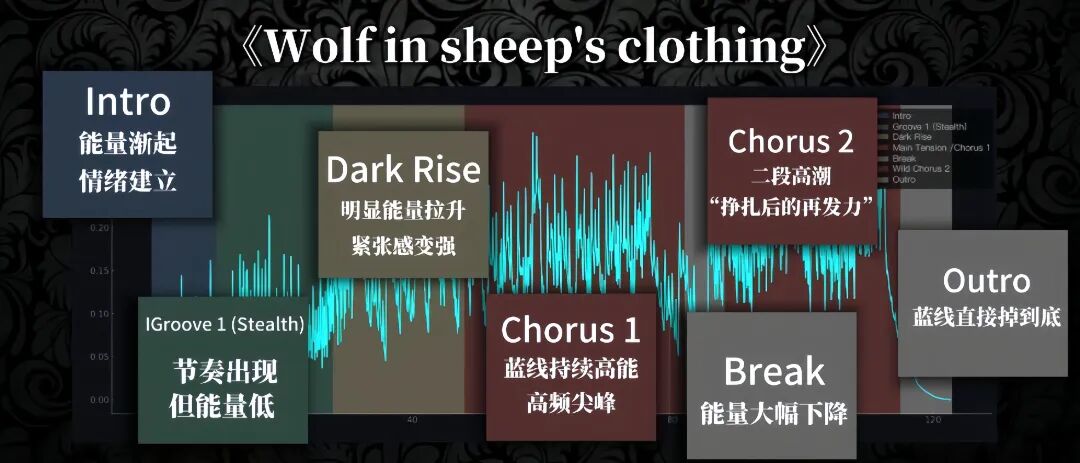 首先我们看图一,观察音乐的情绪线,这首音乐像一只披着羊皮的狼,正在隐藏、靠近、再爆发:暗中窥视 → 潜行 → 暗潮汹涌 → 第一次爆发 → 暂停 → 疯癫式第二爆发 → 戛然而止。