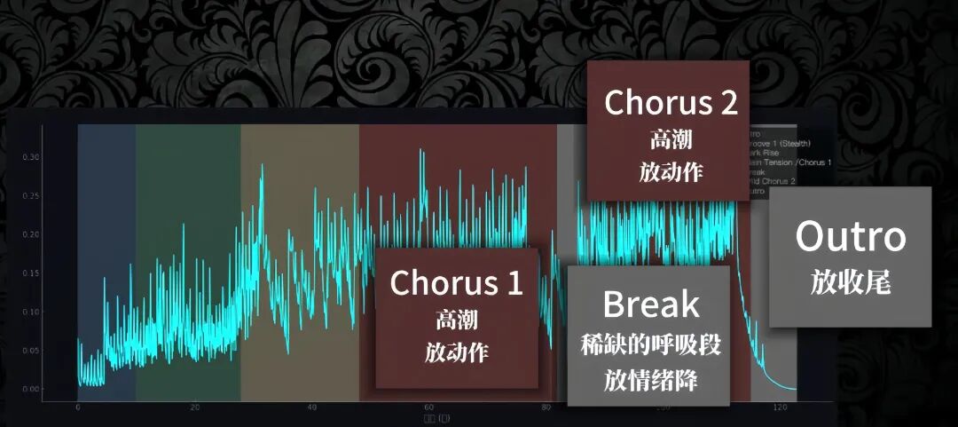 Chorus(高潮)放动作,Break(稀缺的呼吸段)放情绪,Outro放收尾,如图三所示。