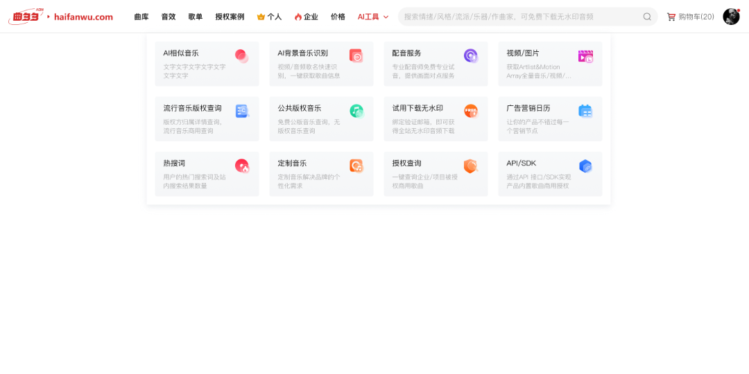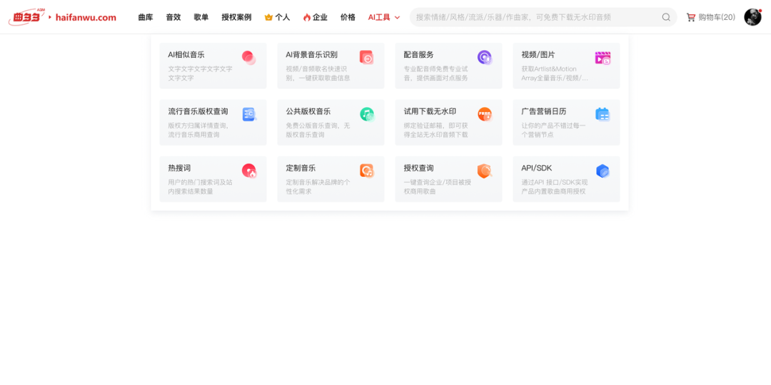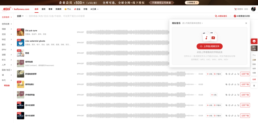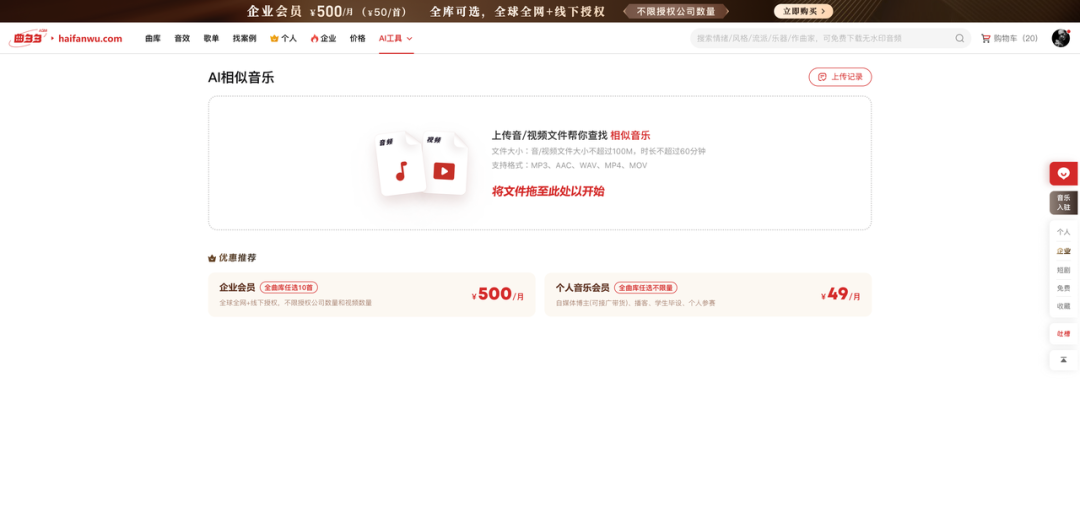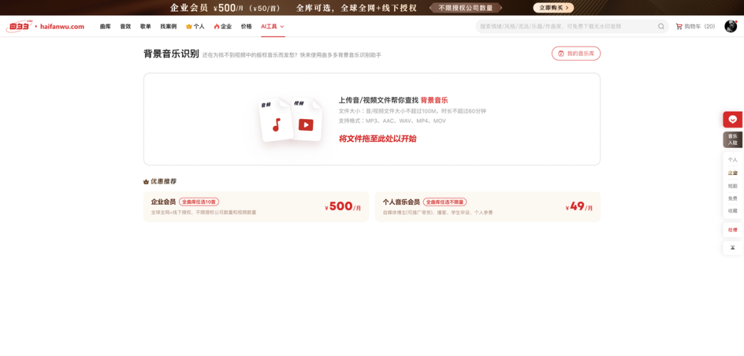 上传你在网易云、Q音或者其他平台上听到的音乐(此处下载音频的方式也是大家可自行其他视频获取),拖到曲多多网站,有两个入口(曲库页面的搜索框—— AI相似音乐,或者AI工具菜单 —— AI相似音乐菜单)AI背景音乐识别上传区域