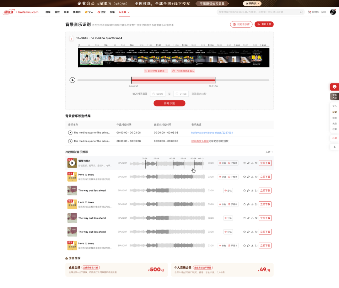 选择你想识别的片段,获得相似音乐的结果列表,根据你需要的权益进行授权就可以啦